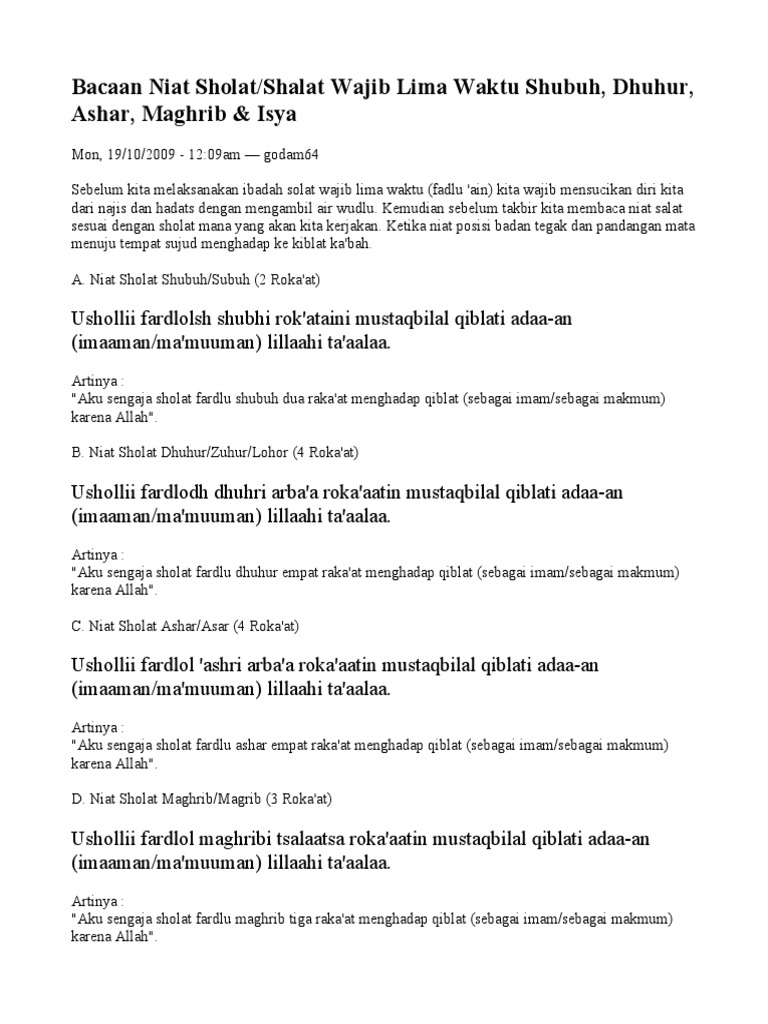 Sholat 5 waktu wajib hukumnya. Arti bacaan sholat yaitu untuk bacaan niat sholat subur berarti aku niat salat fardhu shubuh, dua raka'at, menghadap kiblat, tepat waktu, karena allah ta'ala dan. Tuntunan bacaan niat doa tata cara sholat 5 waktu dan artinya lengkap adalah sebuah. Bacaan doa niat sholat fardu atau wajib 5 waktu. Barangsiapa yang membaca tasbih setelah sholat lima waktu 33 kali, hamdalah 33 kali, takbir 33 kali dan sempurnanya sampai 99 kali yang dilanjutkan dengan membacakan tahlil, maka akan di ampuni semua kesalahannya meskipun sebanyak buih di lautan..